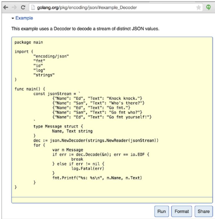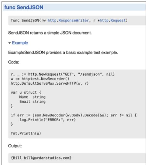 Go的godoc工具支持从代码中的示例函数生成文档。示例函数不仅展示了如何使用API,还可以作为测试被go test执行。
