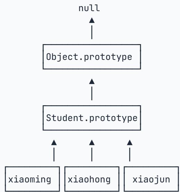 也就是说,xiaoming 的原型指向函数 Student 的原型。如果你又创建了 xiaohong、xiaojun,那么这些对象的原型与 xiaoming 是一样的: