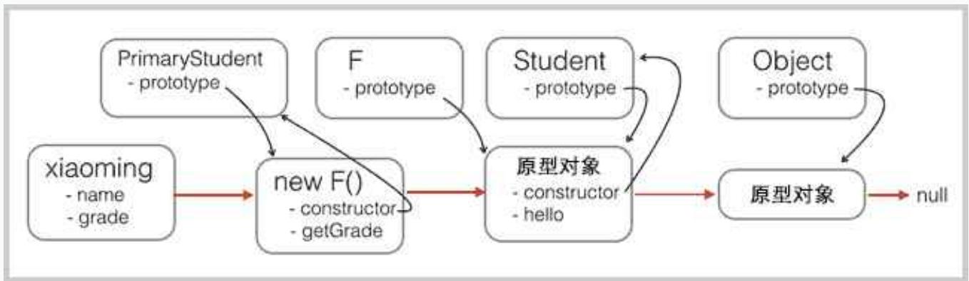new PrimaryStudent() --> PrimaryStudent.prototype --> Student.prototype --> Object.prototype --> null这样,原型链对了,继承关系就对了。新的基于 PrimaryStudent 创建的对象不但能调用 PrimaryStudent.prototype 定义的方法,也可以调用 Student.prototype 定义的方法。