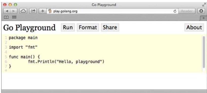 你不需要在本地安装Go就能运行这段代码。Go Playground(http://play.golang.org)提供了一个在浏览器中编辑和运行Go代码的环境(见图4).