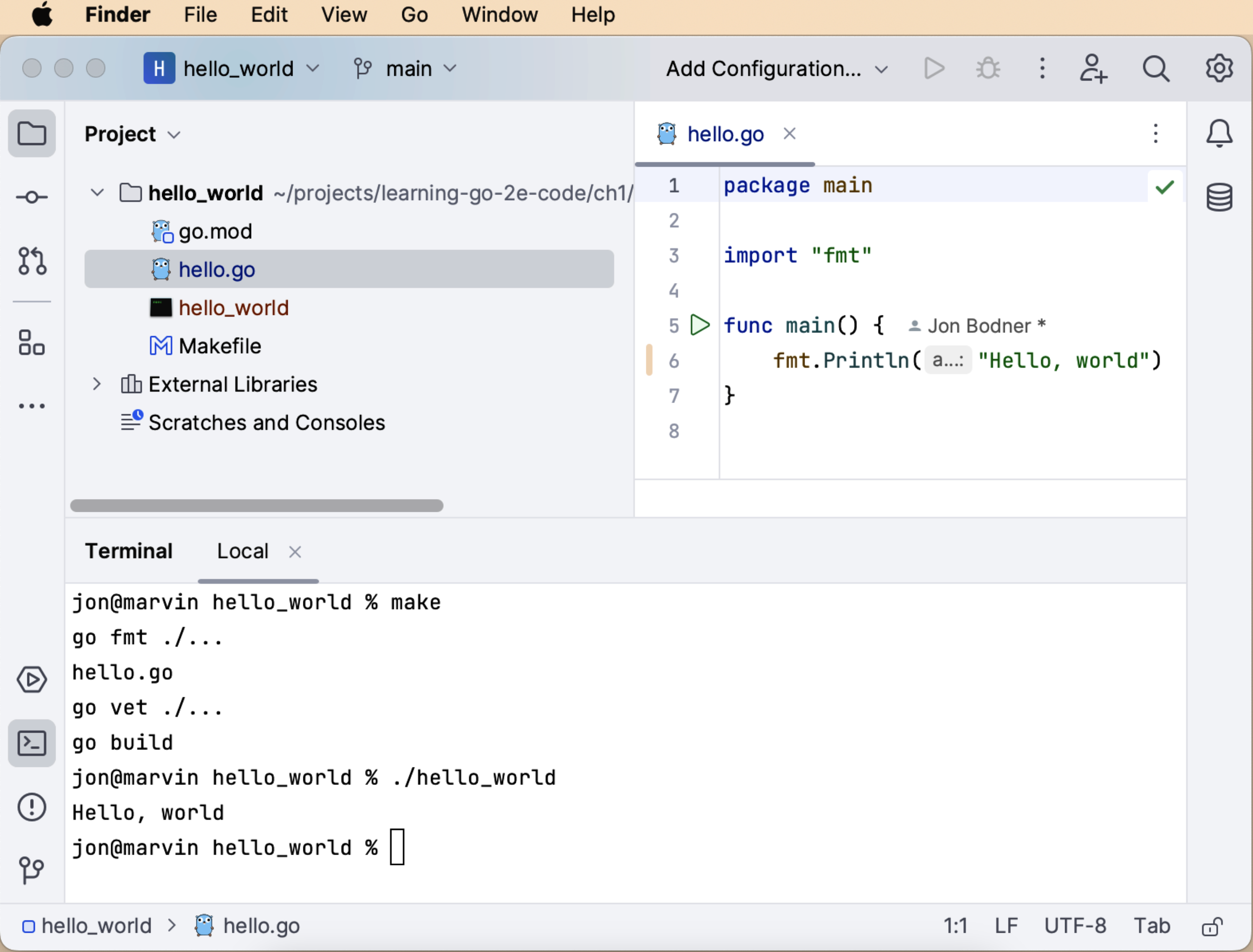 在 ch1 目录下,创建一个名为 hello.go 的文件,内容如下:
