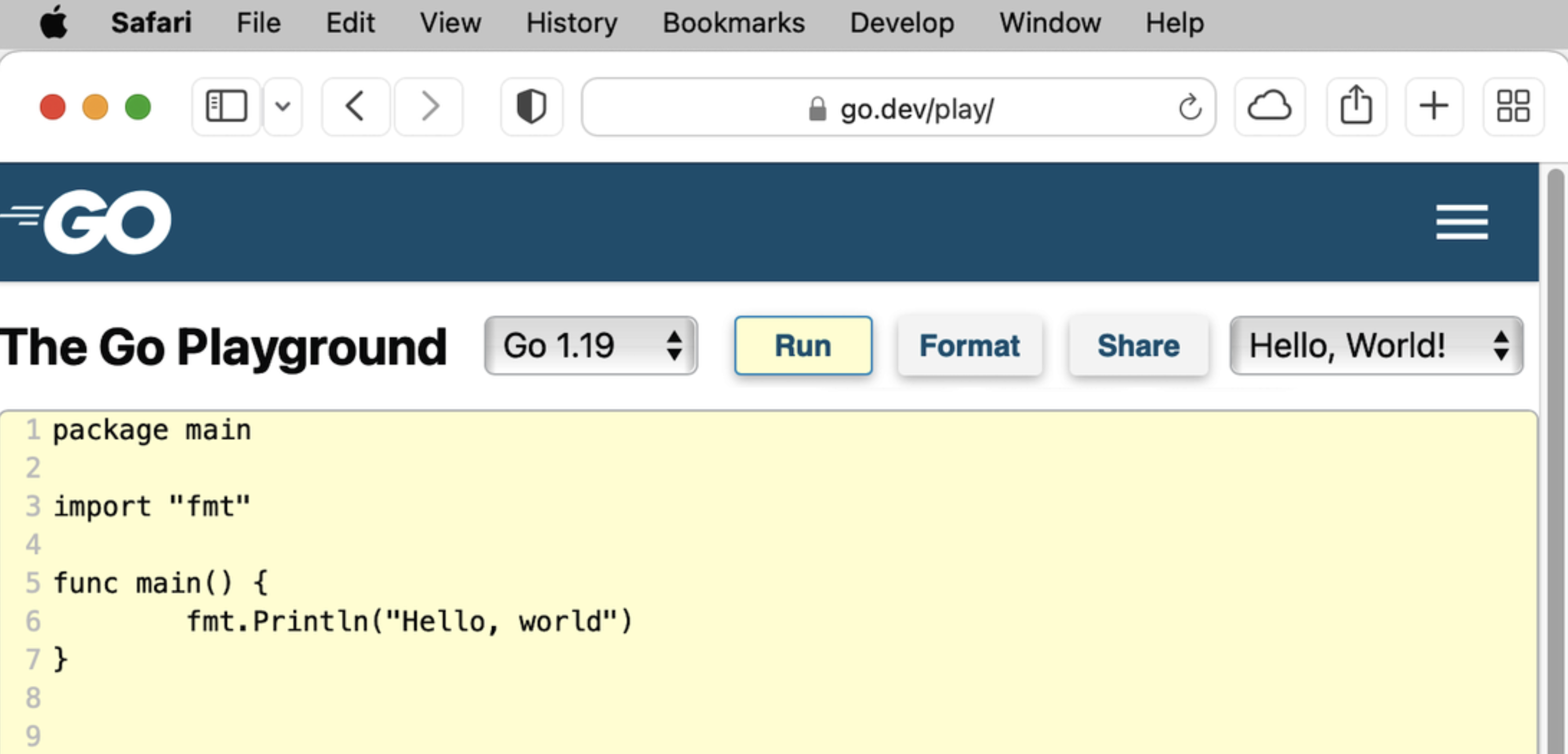 - 在线尝试:将“Hello, World!”程序复制到 https://go.dev/play/ 中运行,并使用 Share 功能生成链接。