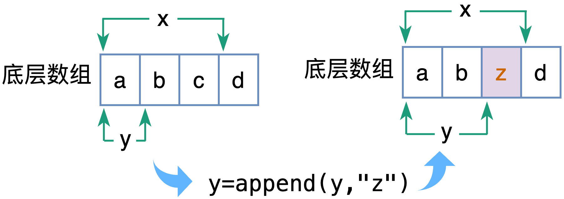 z := x[1:] // ["b", "c", "d"]关键警告:切片操作不会复制数据! 子切片与原始切片共享同一块底层数组内存。修改共享区域的元素,对所有相关切片都可见。