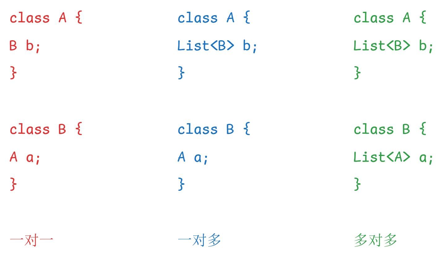 - 一对多:就是一个A类对象对应多个B类对象的情况。例如,在A类中定义一个B类对象的集合作为A类的属性;在B类中定义A类对象a作为B类的属性。