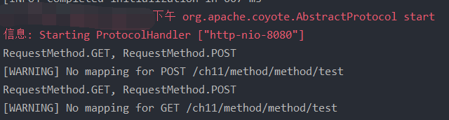 }启动项目后,在客户端依次以GET方式、DELETE方式、POST方式和PUT方式请求访问http://localhost:8080/chapter11/method时,程序会分别执行文件11-6中的get()方法、delete()方法、post()方法和put()方法。控制台输出信息如图11-5所示。