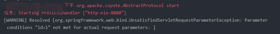 }在文件中,@RequestMapping注解的params属性指定了findById()方法参数id的值为1。项目启动后,在浏览器中输入http://localhost:8080/ch11/params?id=1,控制台输出信息如图所示。