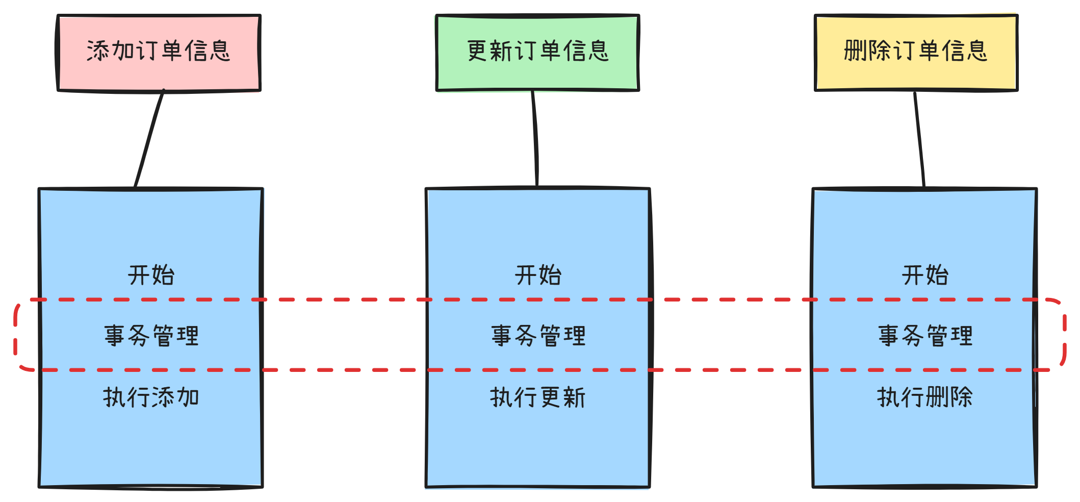 在传统的业务处理代码中,通常都会进行事务处理、日志记录等操作。虽然使用OOP可以通过组合或者继承的方式来实现代码的重用,但如果要实现某个功能(如日志记录),同样的代码仍然会分散到各个方法中。如果想要关闭某个功能,或者对其进行修改,就必须修改所有的相关方法。这不但增加了开发人员的工作量,而且增加了代码的出错率。例如,订单系统中有添加订单信息、更新订单信息和删除订单信息3个方法,这3个方法中都包含事务管理业务代码。订单系统的逻辑如图8-1所示。