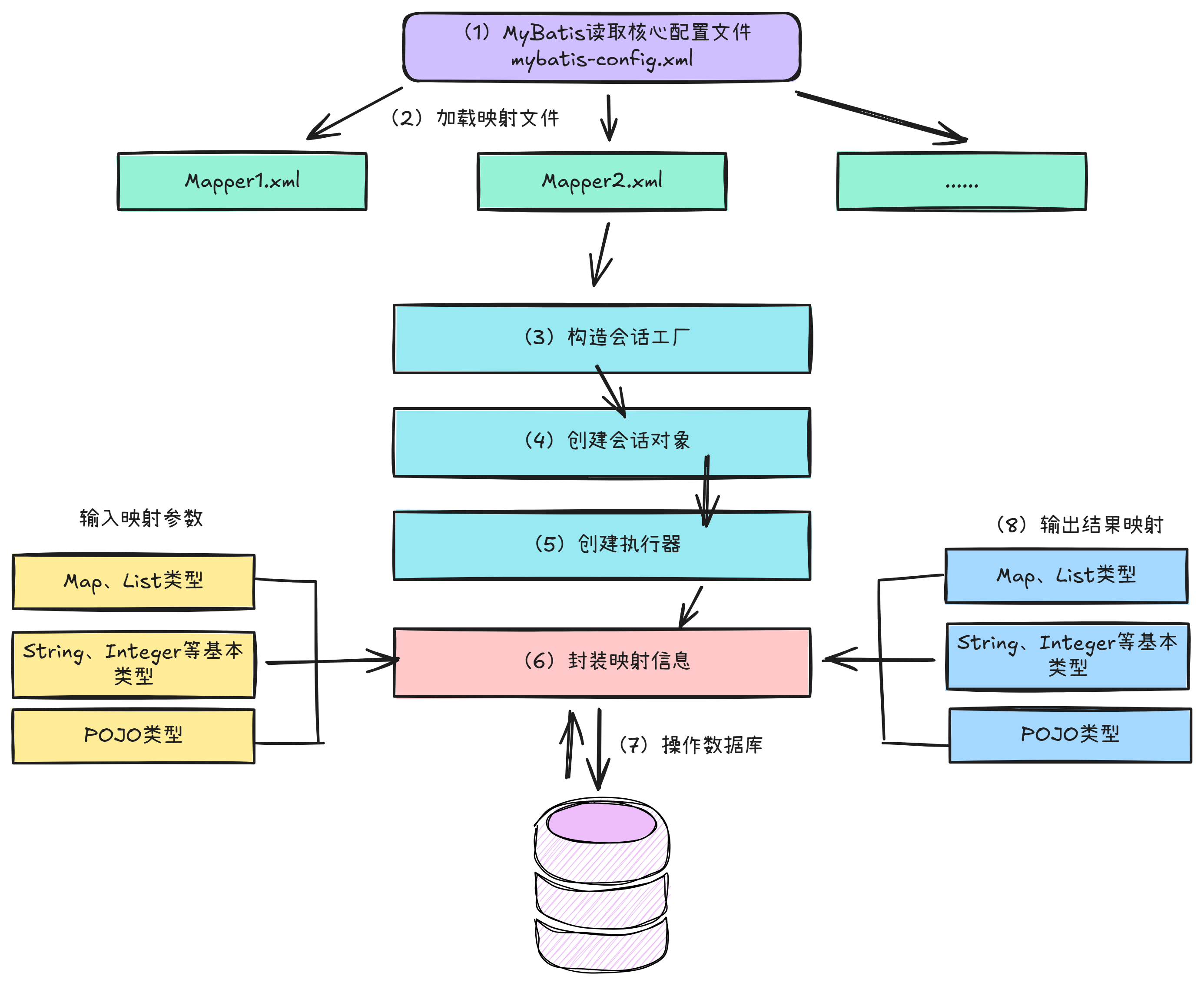 在图1-6中,MyBatis 操作数据库的流程分为 8 个步骤,具体介绍如下: